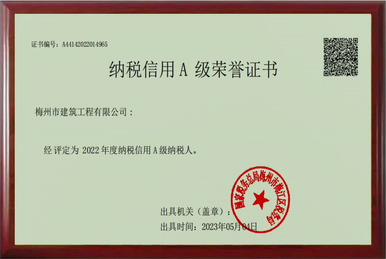 納稅信用A級(jí)榮譽(yù)證書